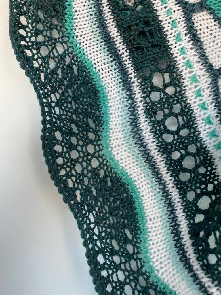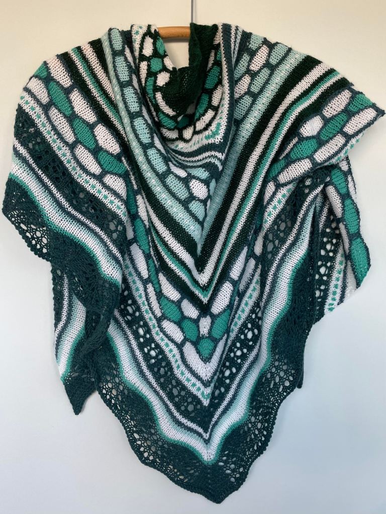 Knitting began when the first of five mystery clues was revealed on April 1 and continued quickly with the release of a new clue each Tuesday; all while learning several new stitches. The hand-dyed organic Merino from Heather Best at Sew Happy Jane had a lovely feel, flowing through my fingers. The Knit Camp pattern from Marie Greene offered clear, tech-edited directions and even provided stitch counts as the shawl grew by four stitches every other row – from just five stitches at cast-on to 419 at bind-off. The end result a triangular shawl featuring lacy scallops and slipped stitches drawn into flowery bursts.