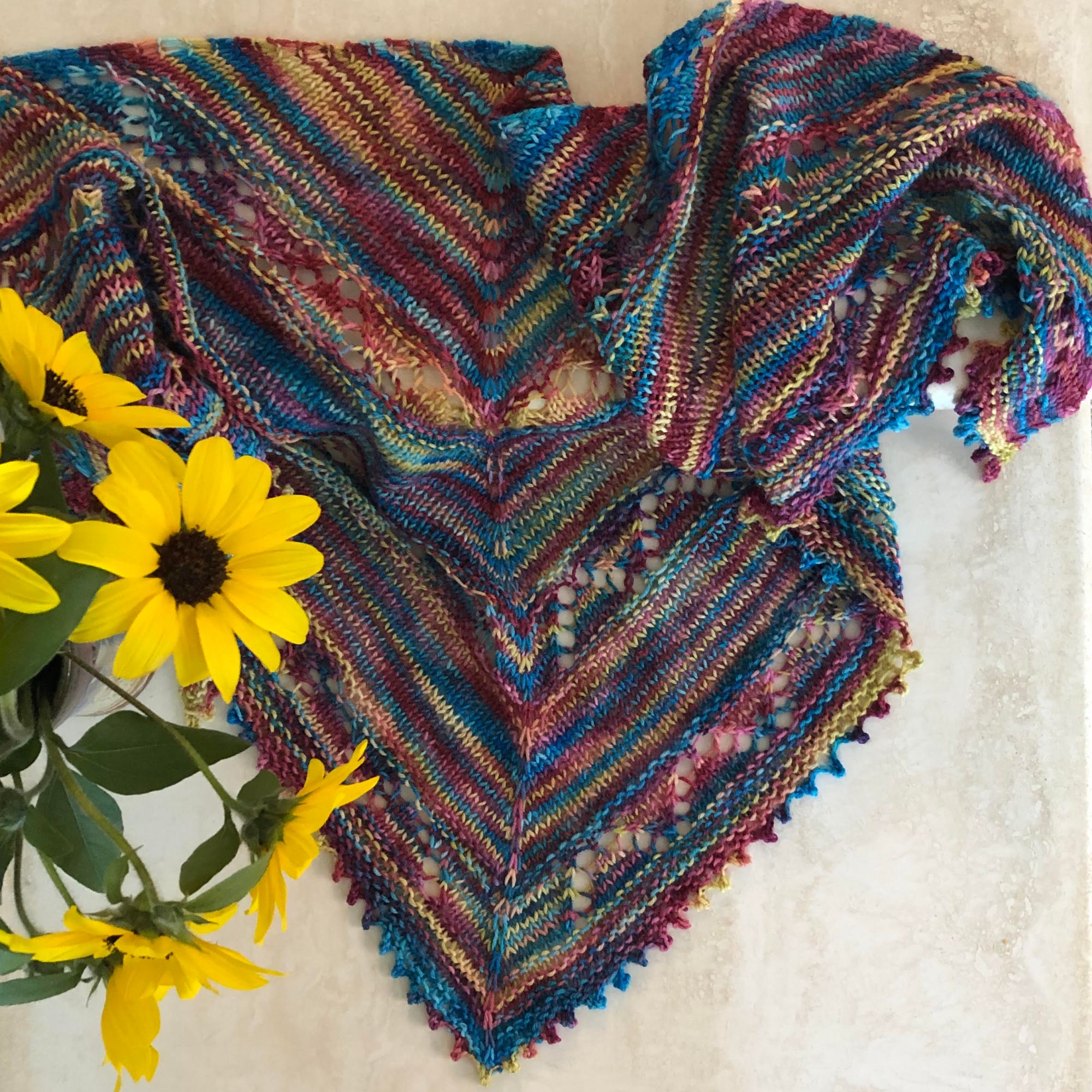 Vintage travel posters inspire a new exclusive fiber series from frabjous fibers & Wonderland Yarns. Amsterdam was the June limited edition colorway and, while this vibrant multi-colored skein was definitely outside my normal color spectrum, Richard and I so loved our time in Amsterdam and the colors are so reminiscent of the city-scape that it became a must have. The Windmill Shawl features a simple lace design reminiscent of the country’s many windmills to which I added a picot edging.